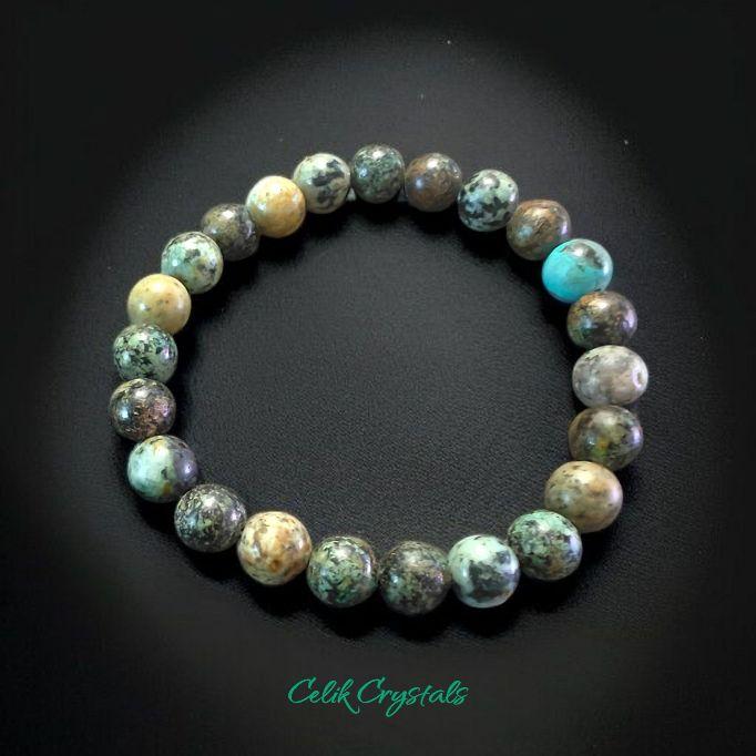 African Turquoise is believed to aid in spiritual growth and positive change. It is believed to assist in opening doors to new opportunities in life. The stones are all natural, believed to bring healing and positivity. Embrace the power of nature with this bracelet.