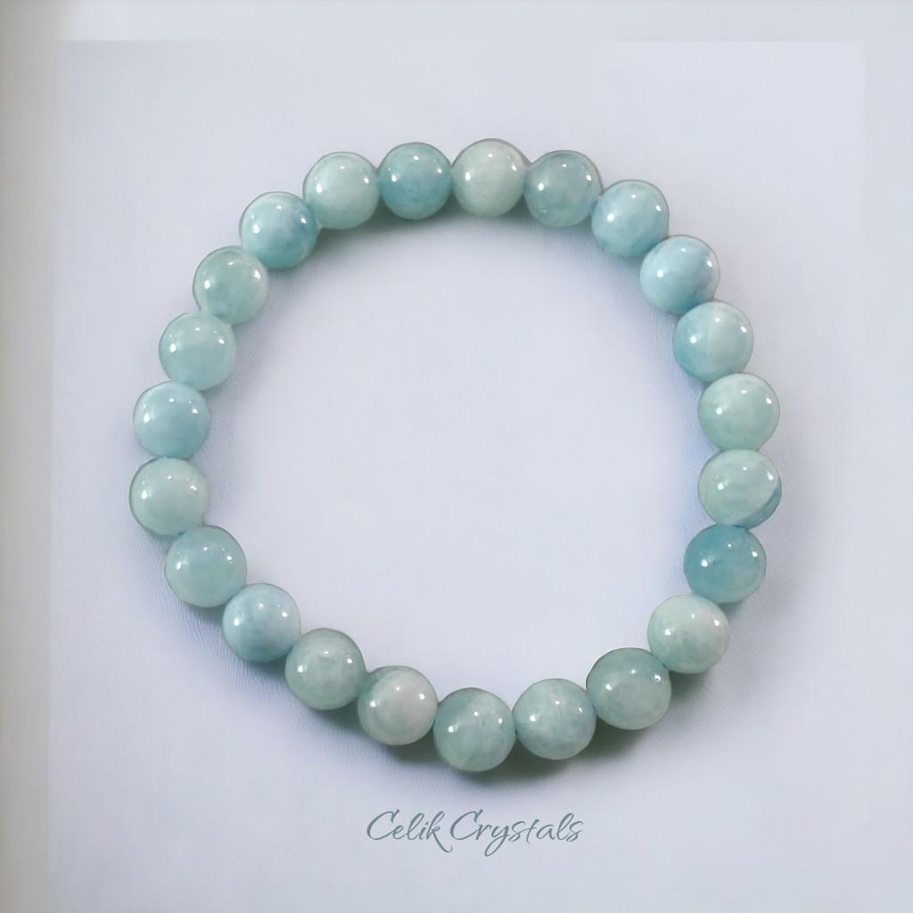 - In conclusion, the Celik Crystals Aquamarine Bracelet is a beautiful piece of jewelry that is made of high-quality, all-natural stones. The bracelet features lovely hues of blue, white, and more, which add to its overall beauty. The aquamarine stone is believed to have properties that can aid in inner spiritual joy and calmness, and the bracelet is made from high-quality stretch cord, which ensures that it is comfortable to wear and can fit a variety of wrist sizes.