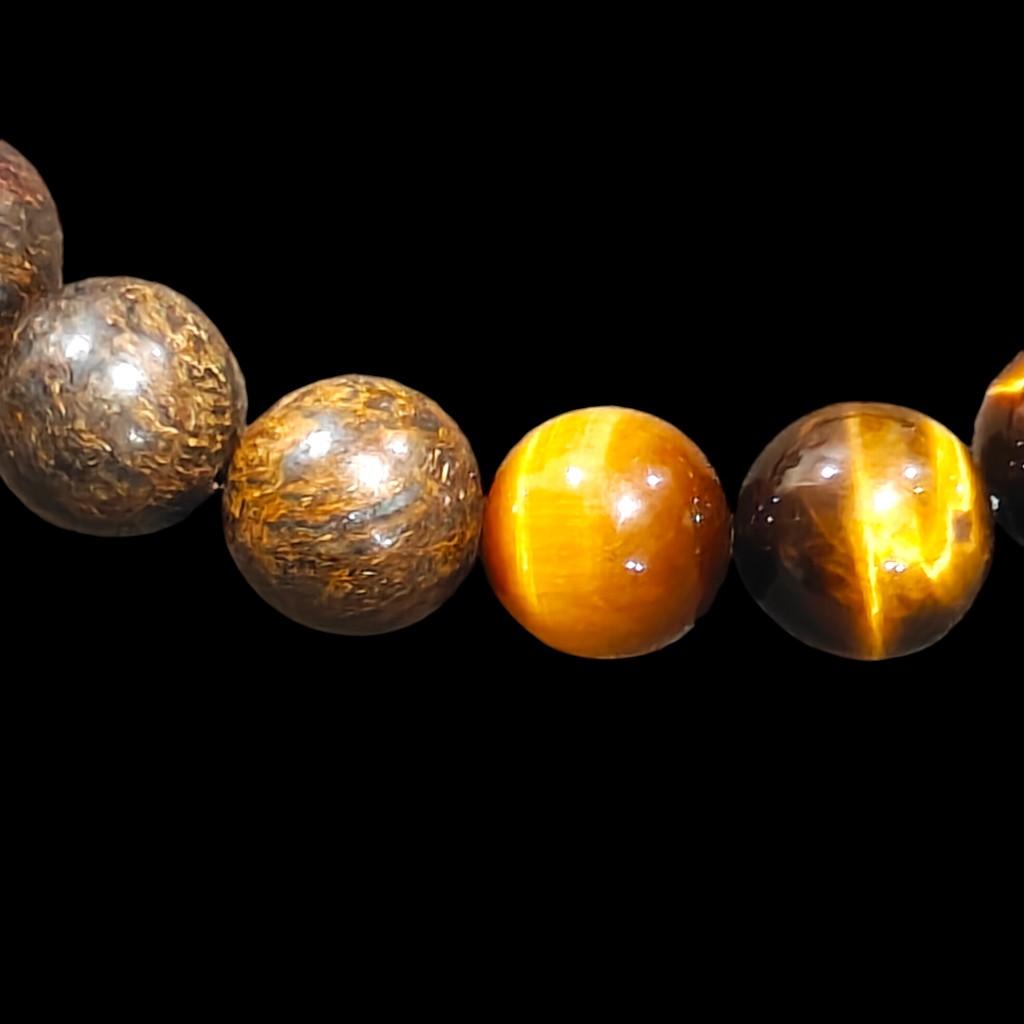 - This bracelet is a stunning piece of jewelry that combines the benefits of Tiger's Eye and Bronzite. The Tiger's Eye beads are 10mm in size and have a unique blend of colors that match perfectly. The stretch band ensures a comfortable fit for the wearer.