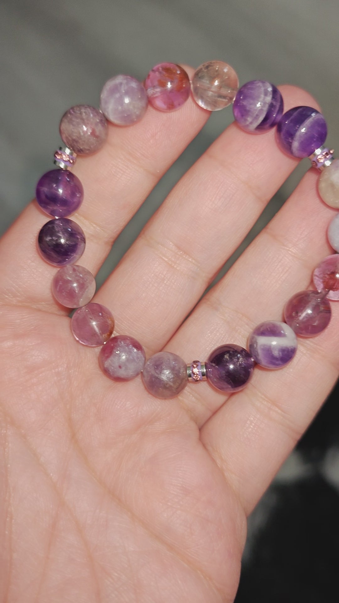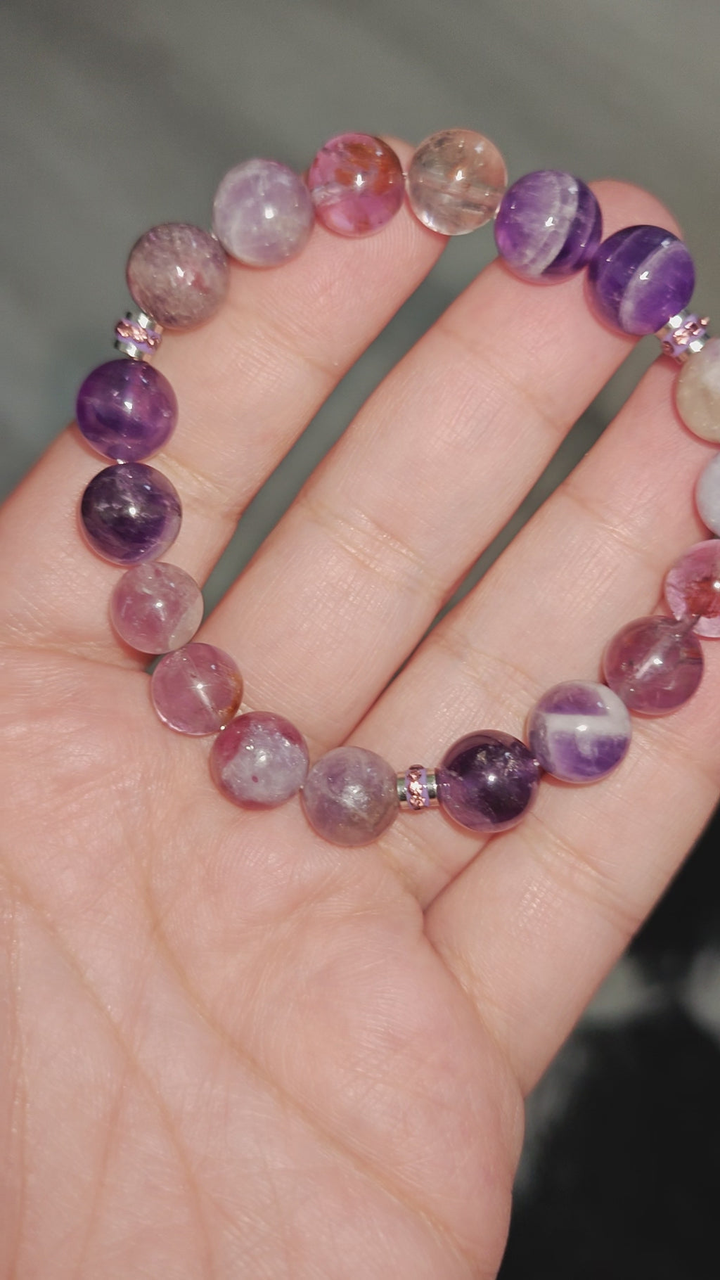 purple and white. It is believed to aid in energy protection and spiritual growth. Purple Ghost Amethyst, another protective stone, enhances the bracelet's spiritual benefits. Both stones are beautifully integrated into the design.