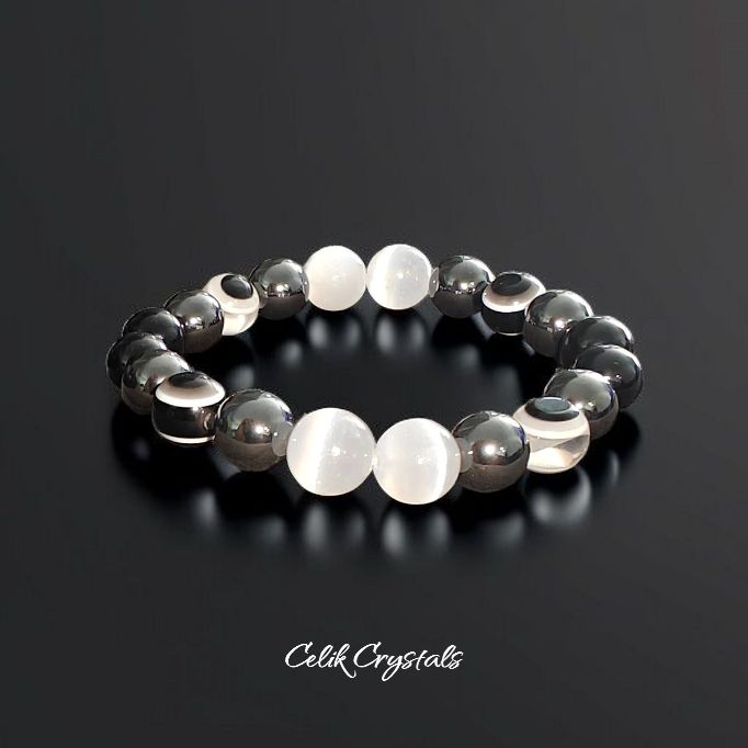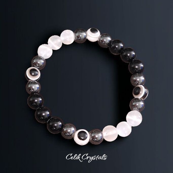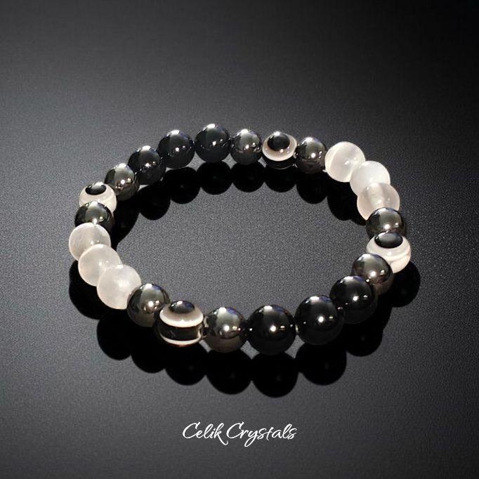 Evil Eye Bracelet Hematite, Selenite, Black Tourmaline Unisex 8 or 10mm Beads
