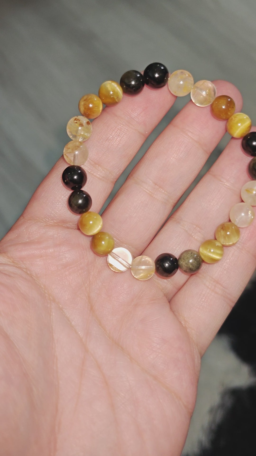 This bracelet features perfectly matching natural stones: Golden Obsidian, Golden Tiger Eye, and Golden Healer Quartz. Each bead is 8mm, designed for unisex wear. The beads sit on a strong stretch band, ensuring comfort and style. This harmonious blend of stones works together for a unique experience.