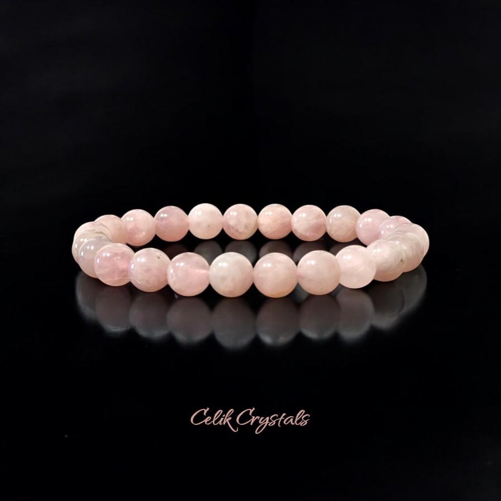 - This Lavender Rose Quartz Bracelet is a beautiful and unique piece of jewelry that is believed to have higher energy vibrations than regular rose quartz. The bracelet features 8mm or 10mm beads made of this rarer version of rose quartz. The strong elastic band ensures a comfortable and secure fit for the wearer.