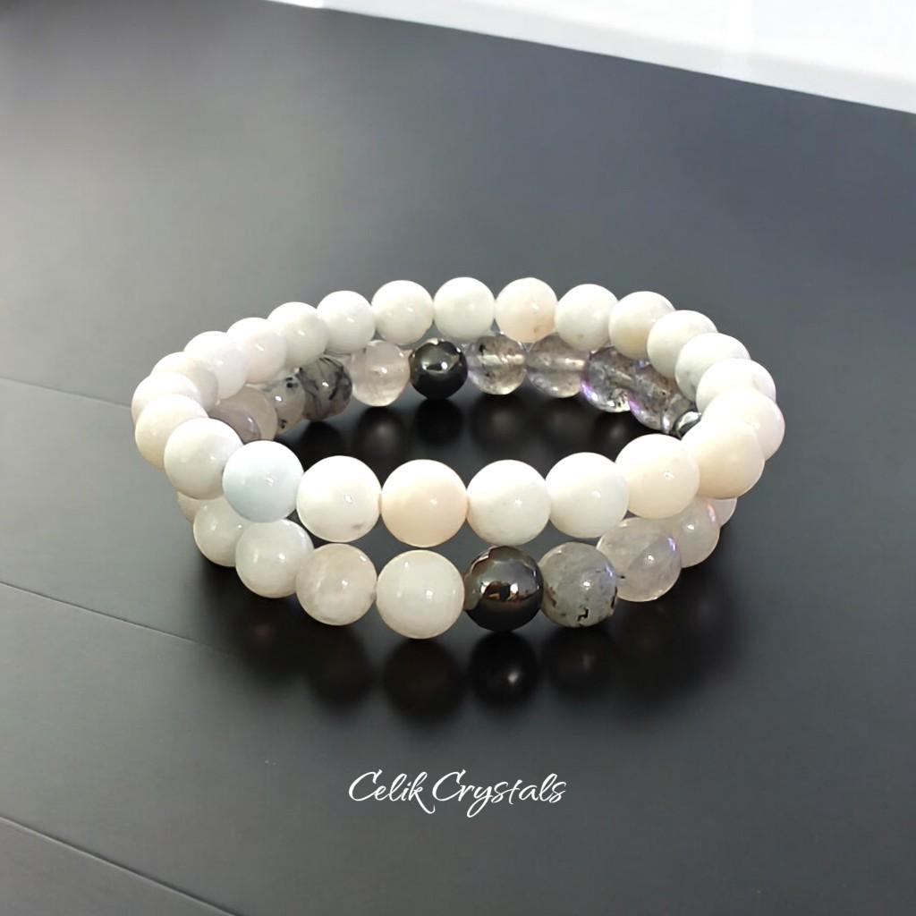 - Introducing the Gorgeous Bracelet Stack, a stunning accessory that features two bracelets in one stack. The first bracelet is made of white opal natural stone, which is known for its calming and soothing properties. The second bracelet features Black Strawberry Quartz, Labradorite, Tourmaline Quartz Crystal, Hematite, and Moonstone, which are believed to have healing properties and can help with emotional balance.